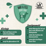 Die Variante Haut und Fell kann stumpfem oder struppigem Fell entgegenwirken. Die enthaltene Bierhefe macht bspw. nicht nur die Haut, sondern auch die Haare widerstandsfähiger und Lachsöl sorgt für glänzendes Fell. Seealgenmehl bietet Nahrung für Fell und Haut, Muskeln und Bindegewebe, stärkt die normale Funktion vom Immunsystem und unterstützt die Magen-Darm-Flora.
