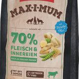 Rinti Max-i-Mum wird mit 65% frischem Fleisch und frischen Innereien zubereitet. Dies entspricht über 90% der eingesetzten Fleischmaterialien. Dadurch wird der natürliche Fleischgeschmack gefördert und die Nahrungsverwertung unterstützt. Mit einem erhöhten Fettgehalt ist ein ausgewogenes Protein-/Fett-Verhältnis für eine schonende Verdauung gewährleistet. Hunde sind von Natur aus Fleischfresser, deshalb verwendet Rinti Max-i-Mum hohe Frischfleischgehalte, die in einem aufwendigen Produktionsprozess verarbeitet werden und kein Getreide.