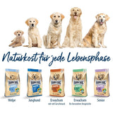 Ab dem 18. Monat sollte langsam auf ein Happy Dog Adult-Futter, zum Beispiel NaturCroq Rind&Reis oder NaturCroq Active, umgestellt werden.