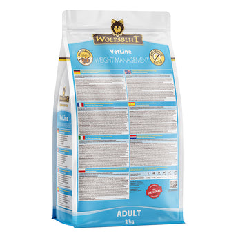 WOLFSBLUT VetLine WEIGHT MANAGEMENT ist ein Diät-Alleinfuttermittel für ausgewachsene Hunde zur Verringerung von Übergewicht und zur Regulierung der Glucoseversorgung (Diabetes mellitus).