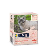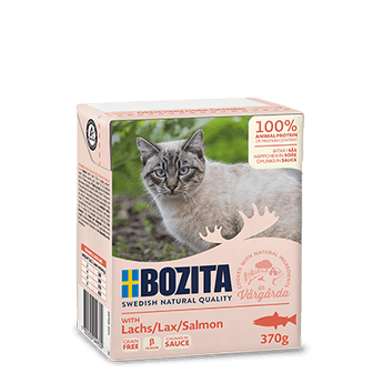Bozita Häppchen in Soße mit Lachs ist eine von sechs leckeren, traditionellen schwedischen Geschmacksrichtungen. Eine komplette Katzennahrung für junge Kätzchen und erwachsene Katzen. Bozita Häppchen in Soße wird in praktischen, umweltfreundlichen Verpackungen angeboten, die sich beim Öffnen und Schließen einfach bedienen lassen. Bozita wird aus qualitativ hochwertigen Rohstoffen wie Fleisch und Fisch hergestellt. Das Produkt enthält weder Soja oder Getreide noch Konservierungsstoffe und es ist fettarm – nur 5 % Fett.