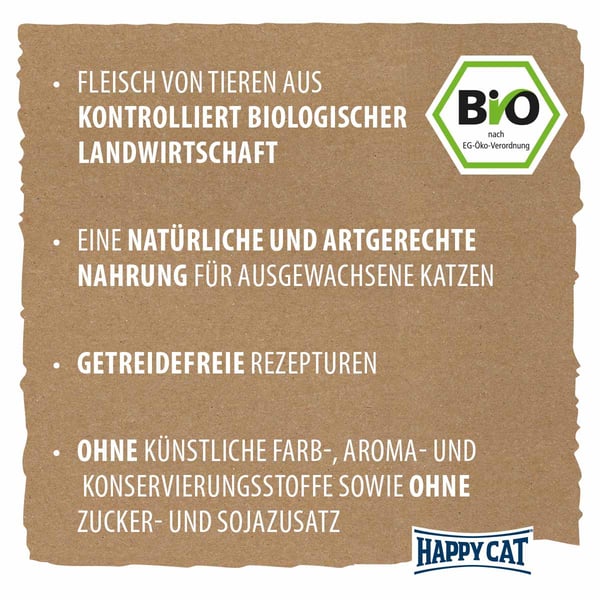 Happy Cat All Meat Bio Huhn wird mit hochwertigem Fleisch sorgfältig zubereitet. Die getreidefreie Nahrung in Bio-Qualität verwöhnt ausgewachsene Samtpfoten und liefert alles für ein vitales Katzenleben.