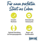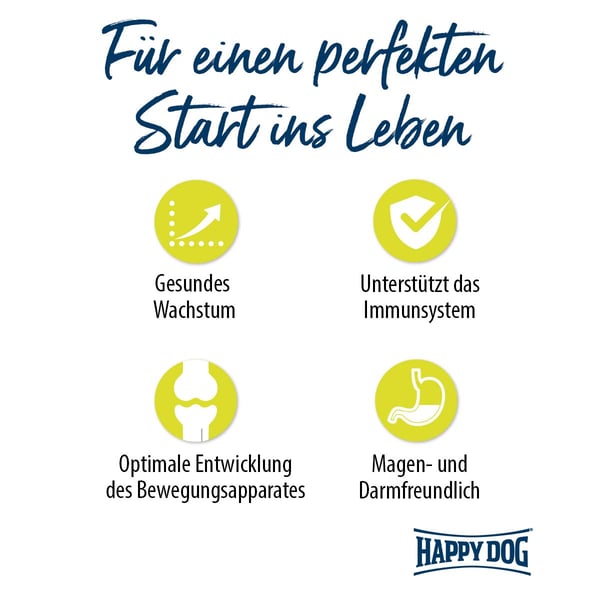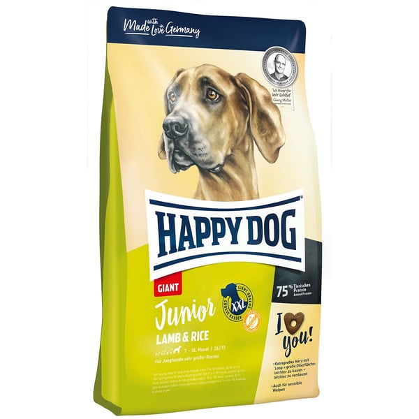 Ab dem 7. Lebensmonat sinkt die Wachstumsintensität langsam ab. Gerade bei Junghunden sehr großer Rassen muss das Futter auf den nun geänderten Protein- und Energiebedarf angepasst werden, um ernährungsbedingten Wachstumsstörungen vorzubeugen. Happy Dog Junior Giant Lamb & Rice ist optimal an die Bedürfnisse von Junghunden sehr großer Rassen angepasst und sorgt für ein harmonisches Wachstum in der Junghunde-Phase. Neben einem reduzierten Energiegehalt ist auch der Proteingehalt angepasst. Die geflügelfreie Rezeptur von Happy Dog Junior Giant Lamb & Rice mit schmackhaftem Lamm, hochverdaulichem Reis und wertvoller Neuseeland-Muschel für die Gelenke, sorgt für eine optimale Entwicklung - auch von sensiblen Junghunden. Basierend auf dem Happy Dog Natural Life Concept ® wird dein Hund mit allem versorgt, wovon sein Organismus ganzheitlich profitiert. Ebenso wie im Welpenfutter unterstützen Leinsamen, ausgewählte Kräuter und Vitamin C den Verdauungstrakt, das Immunsystem und die ungesättigten Fettsäuren aus Leinsamen sorgen für ein glänzendes Fell.