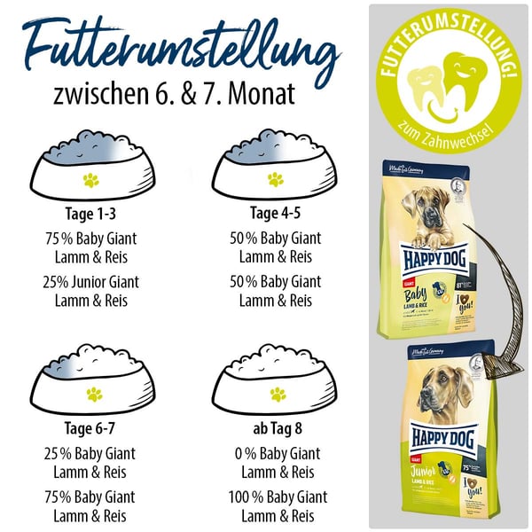 Ab dem 18. Lebensmonat sollte langsam auf ein Adult-Futter umgestellt werden. Hier können wir dir z.B. Happy Dog Sensible Neuseeland empfehlen.