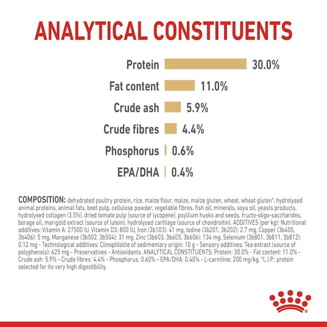 ZUSAMMENSETZUNG: Geflügelprotein getrocknet, Reis, Maismehl, Mais, Maiskleber, Weizen, Weizenkleber*, hydrolysierte Tierproteine, Tierfett, Rübenschnitzel, Pulvercellulose, pflanzliche Fasern, Mineralstoffe, Fischöl, Sojaöl, Hefenerzeugnisse, hydrolysiertes Kollagen (0,84%), Tomatenpülpe getrocknet (Quelle für Lycopen), Psyllium (Schalen und Samen), Fructo-Oligosaccharide, Borretschöl, Tagetesmehl, Knorpel hydrolysiert (Quelle für Chondroitin)