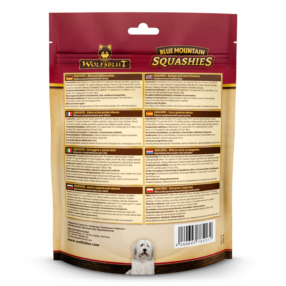 Wolfsblut Squashies sind softe Hundesnacks ohne Getreide, die als Belohnungs- oder Trainingssnack perfekt geeignet sind. Durch ihre softe Konsistenz sind sie leicht zu kauen..Blue Mountain Squashies von Wolfsblut ergänzen die tägliche Ernährung Ihres Hundes. Sie sind eine gesunde Belohnung oder eine kleine Mahlzeit für unterwegs. In Verbindung mit einer Wolfsblut-Futtersorte ermöglichen die Blue Mountain Squashies eine rundum gesunde und artgerechte Ernährung Ihres Hundes. Dabei dienen alle Zutaten dieser einzigartigen Kombination dem Erhalt der Gesundheit Ihres Schützlings. Blue Mountain Squashies von Wolfsblut eignen sich auch für allergiegefährdete Hunde und Allergiker..